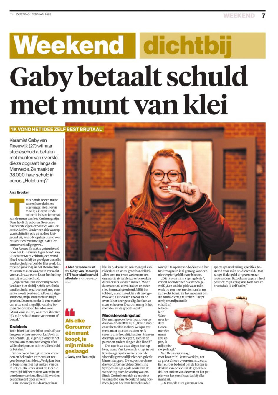 Voor € 2 euro krijgt u een munt gemaakt van Gorcumse klei. Hiervan gaat € 1 euro naar de aflossing van mijn studieschuld en € 1 euro naar de productiekosten.